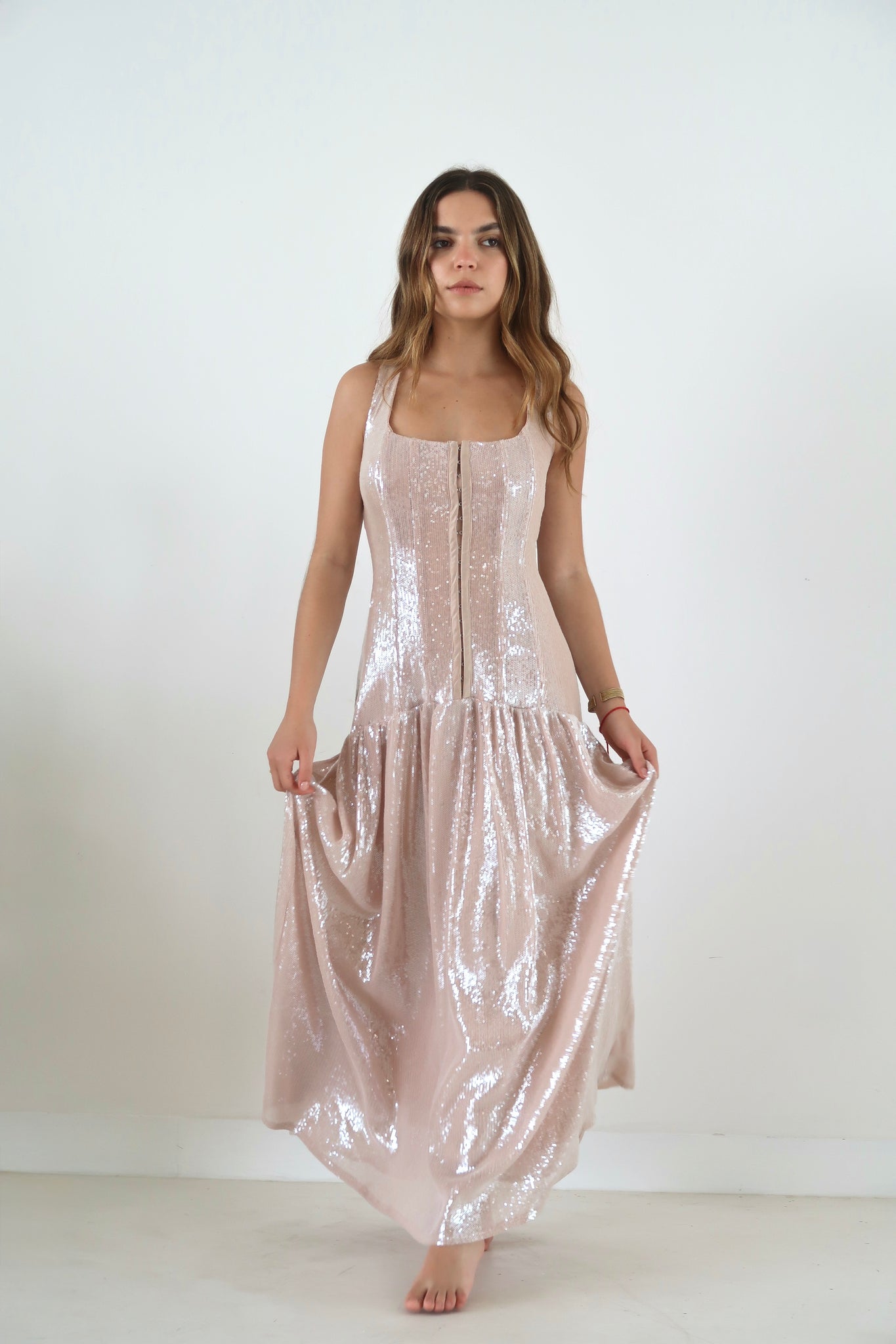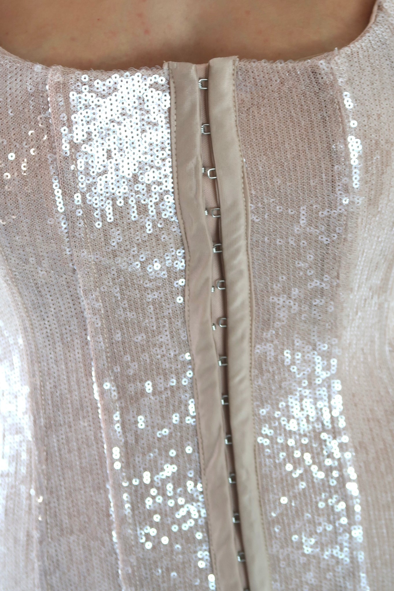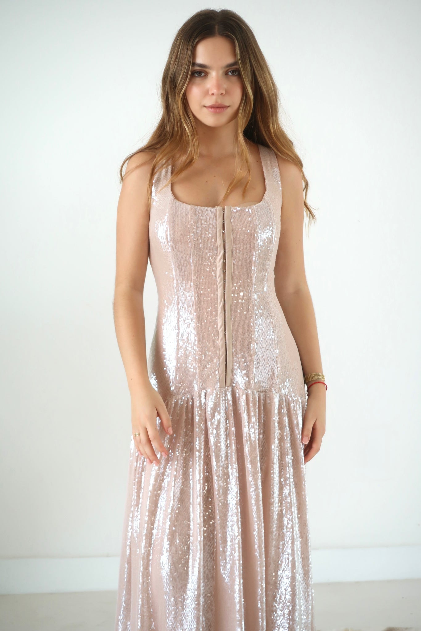 Maxi dress de lentejuelas con corset de cierre de ganchos.