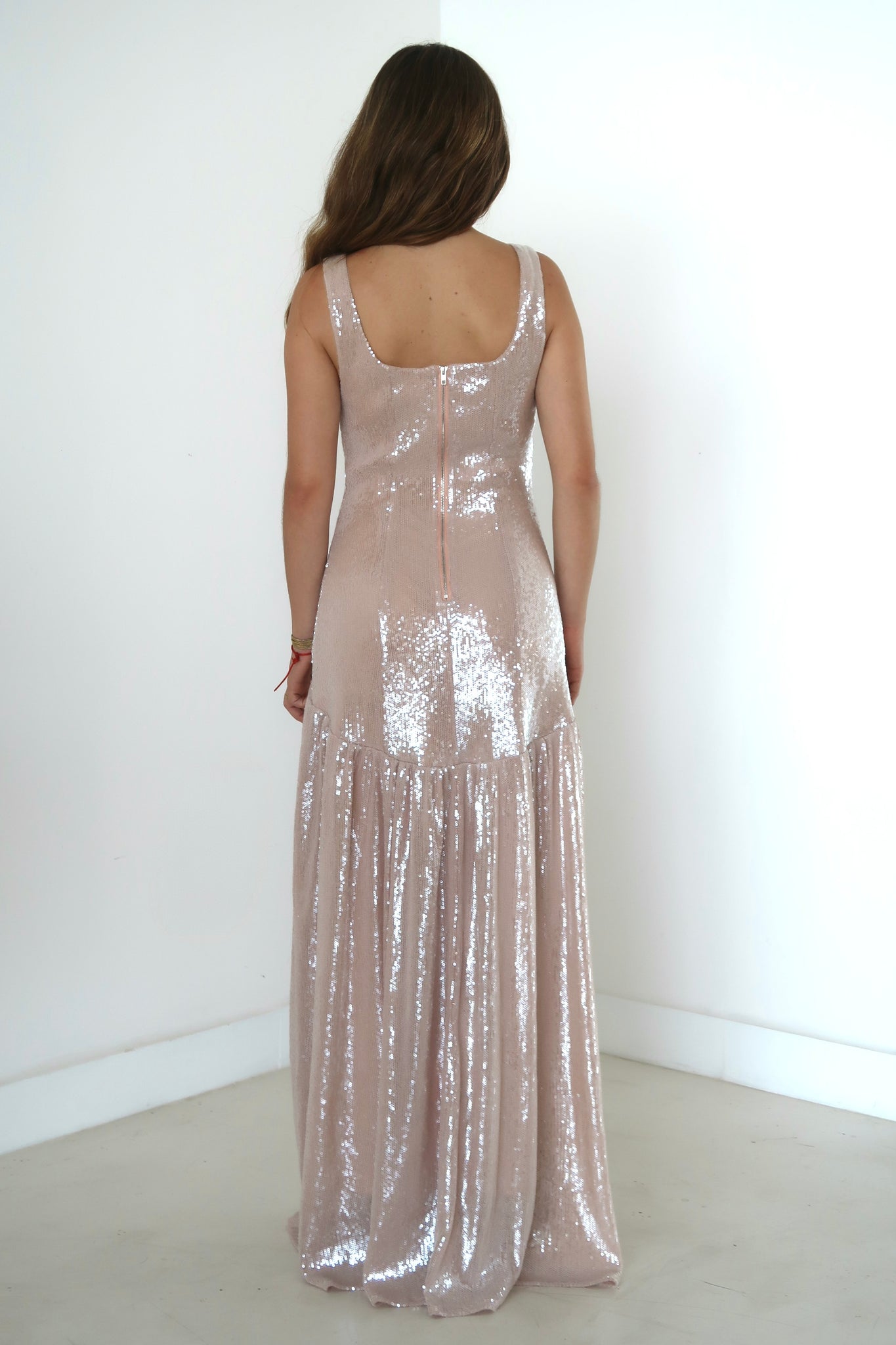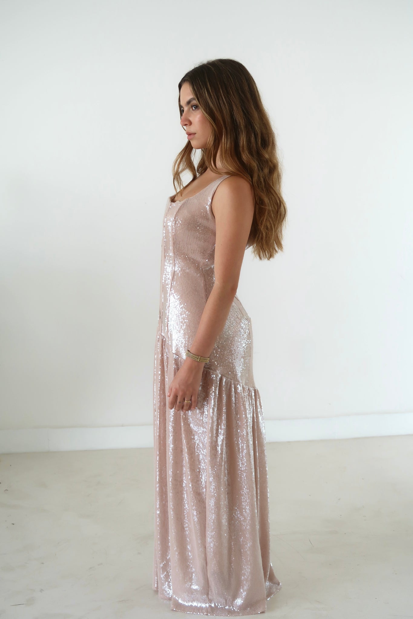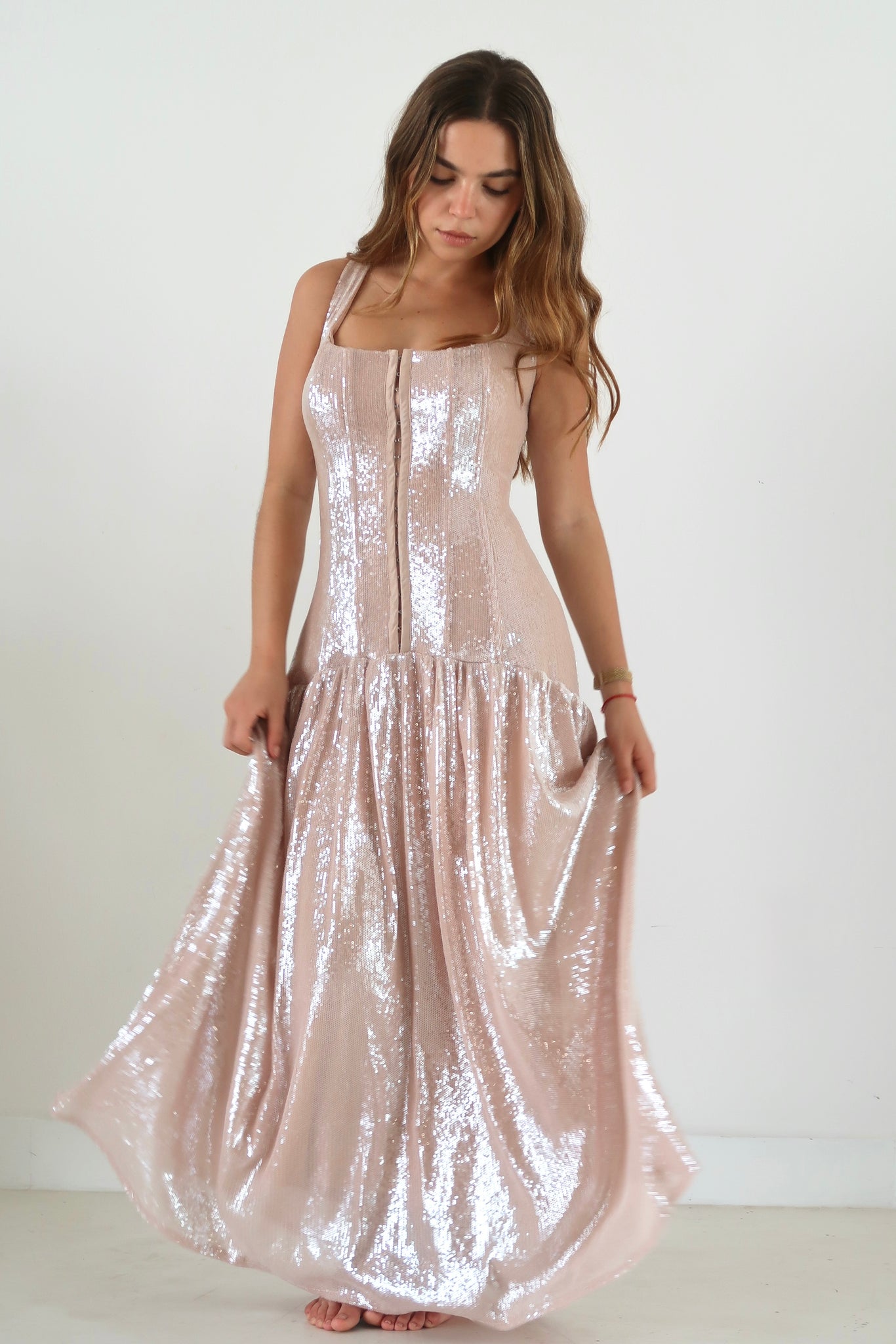 Maxi dress de lentejuelas con corset de cierre de ganchos.