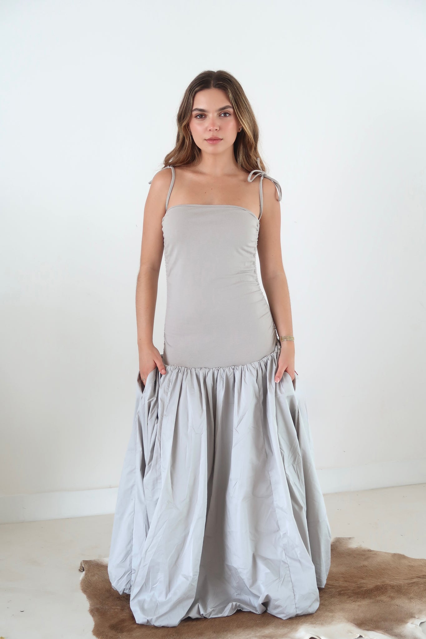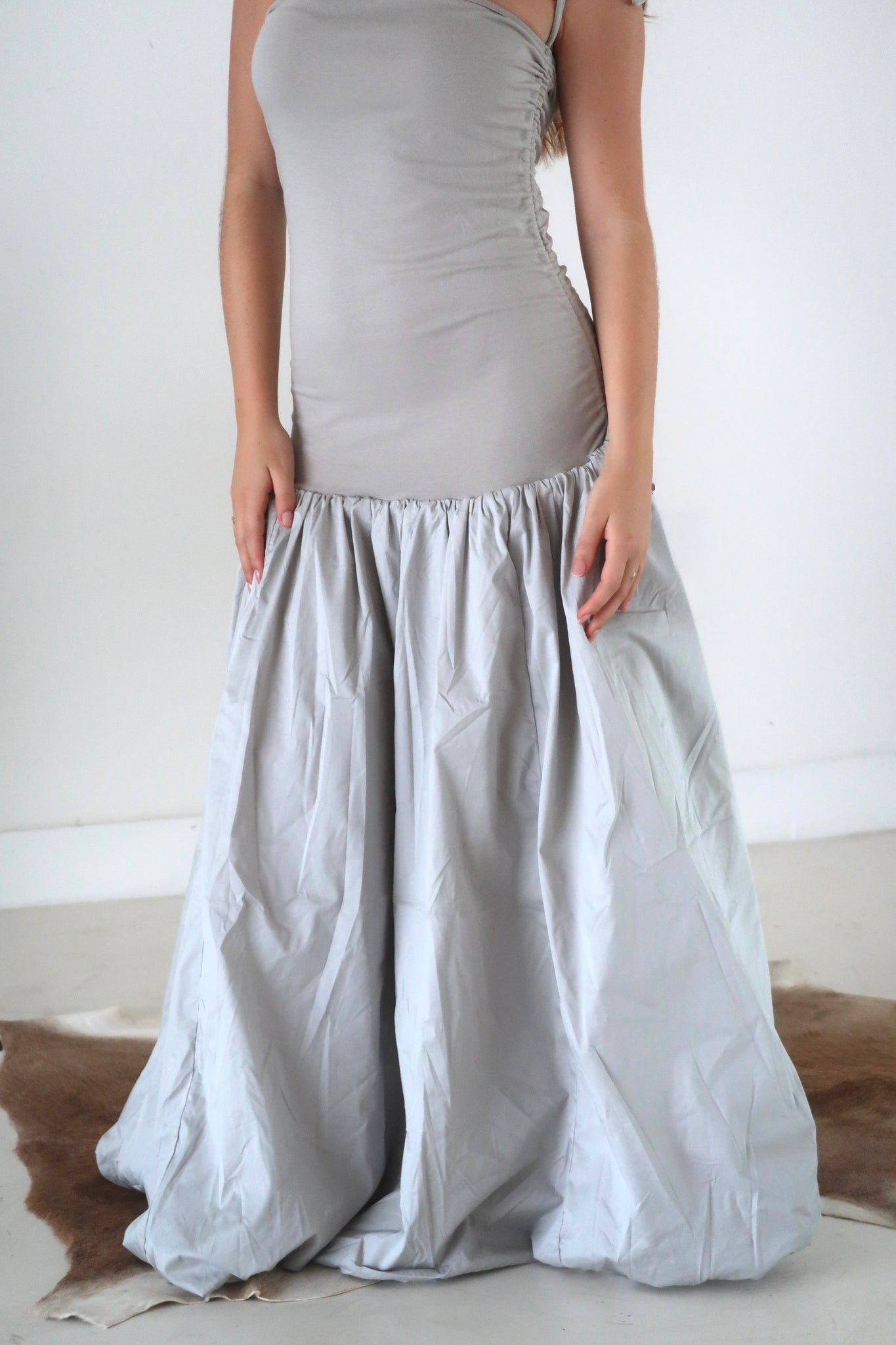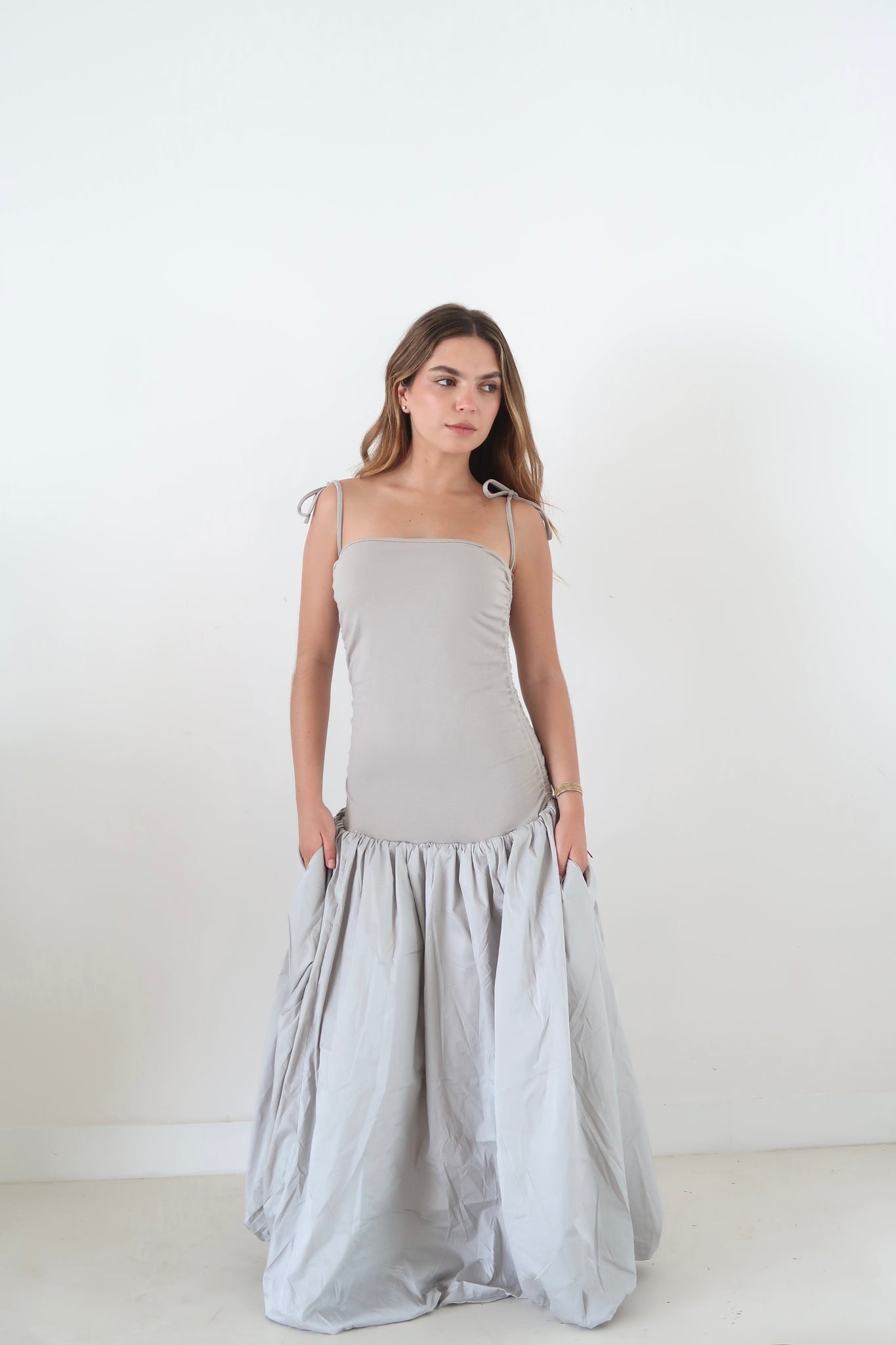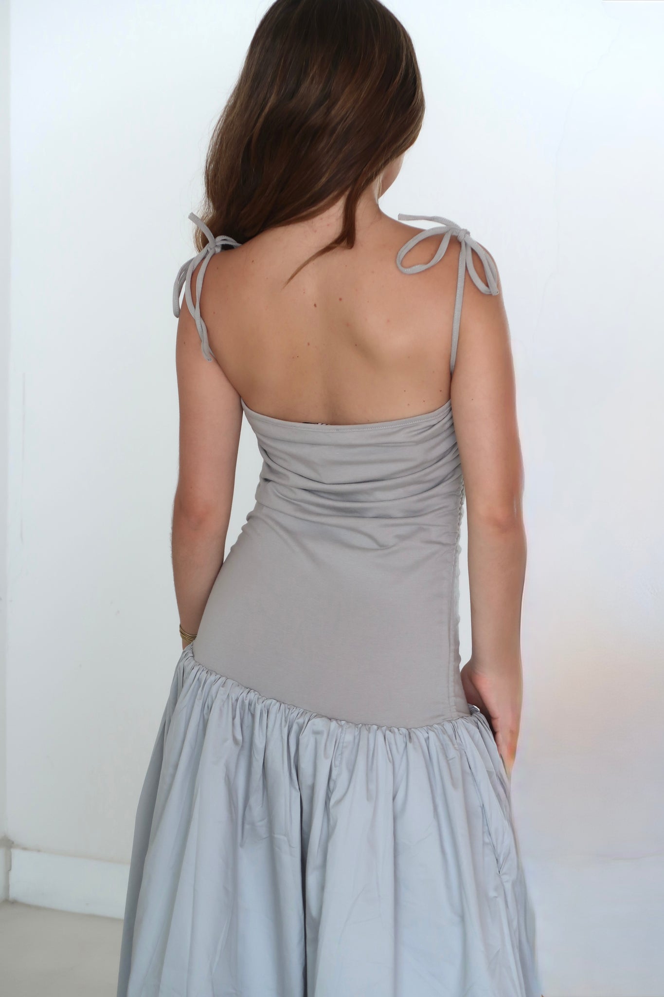 Detalles de lazo con cordón a ambos lados del top para crear un ligero efecto arrugado. La falda está completamente forrada y tiene un efecto globo puff clásico.